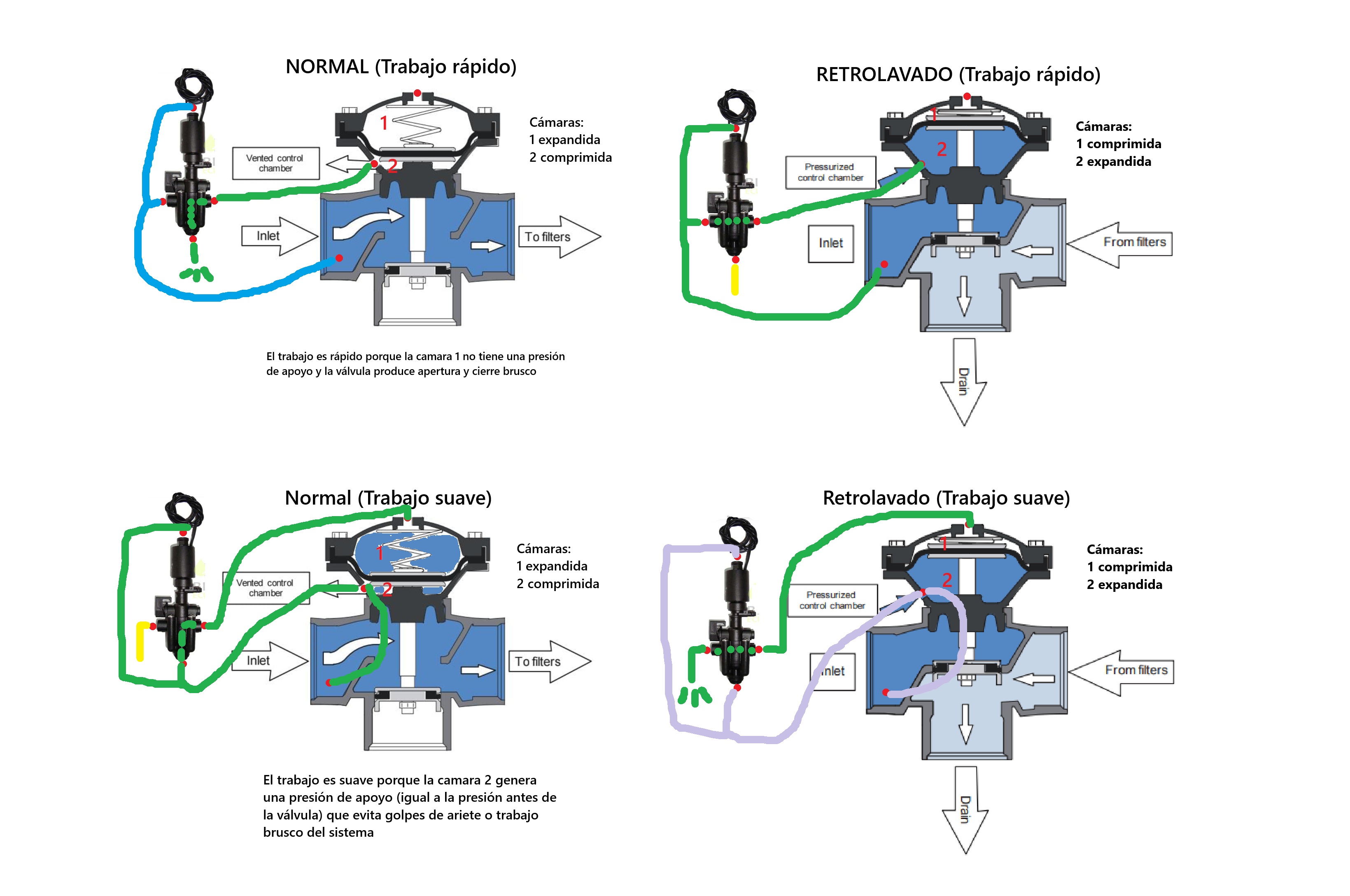 En ambos casos, el flujo de agua bruta procede de la conexión de entrada a la de salida de la válvula