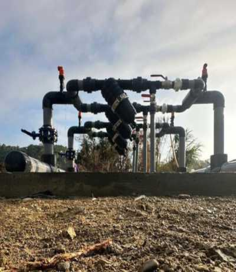 Cuatro filtros en paralelo, válvulas manuales metálicas, tubería para estructura, accesorios de conexión, toma de agua, válvula de aire y manómetro.