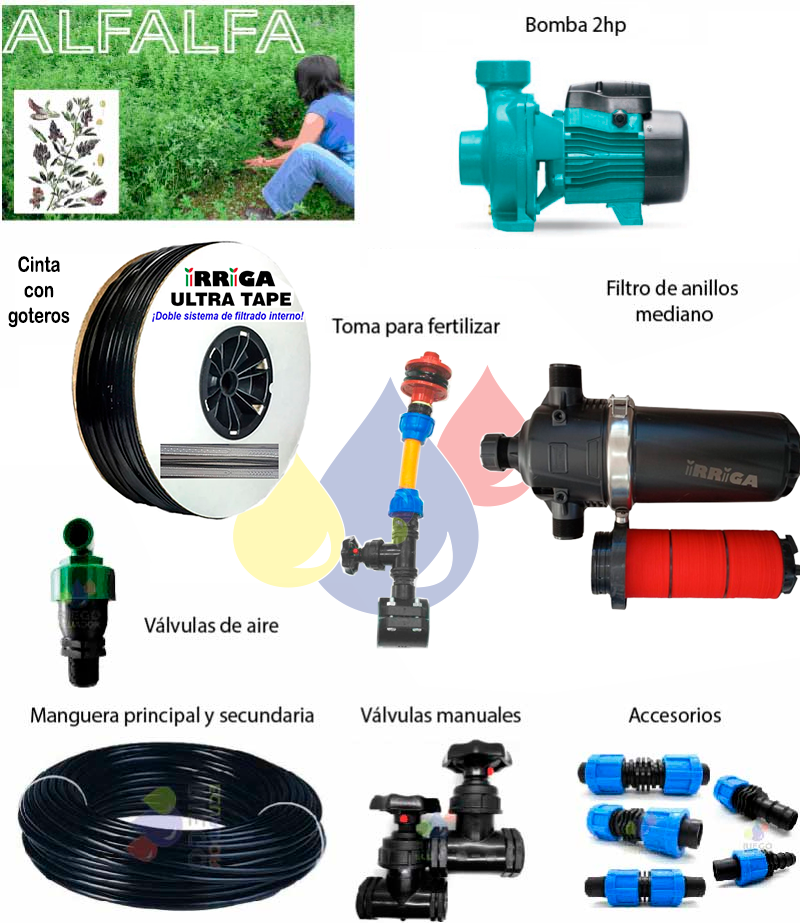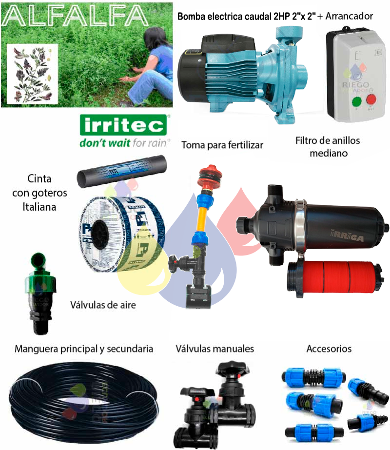 Kit Alfalfa Eco 1 ha + Bomba Leo 2hp + Filtro + Valvulas + Cinta